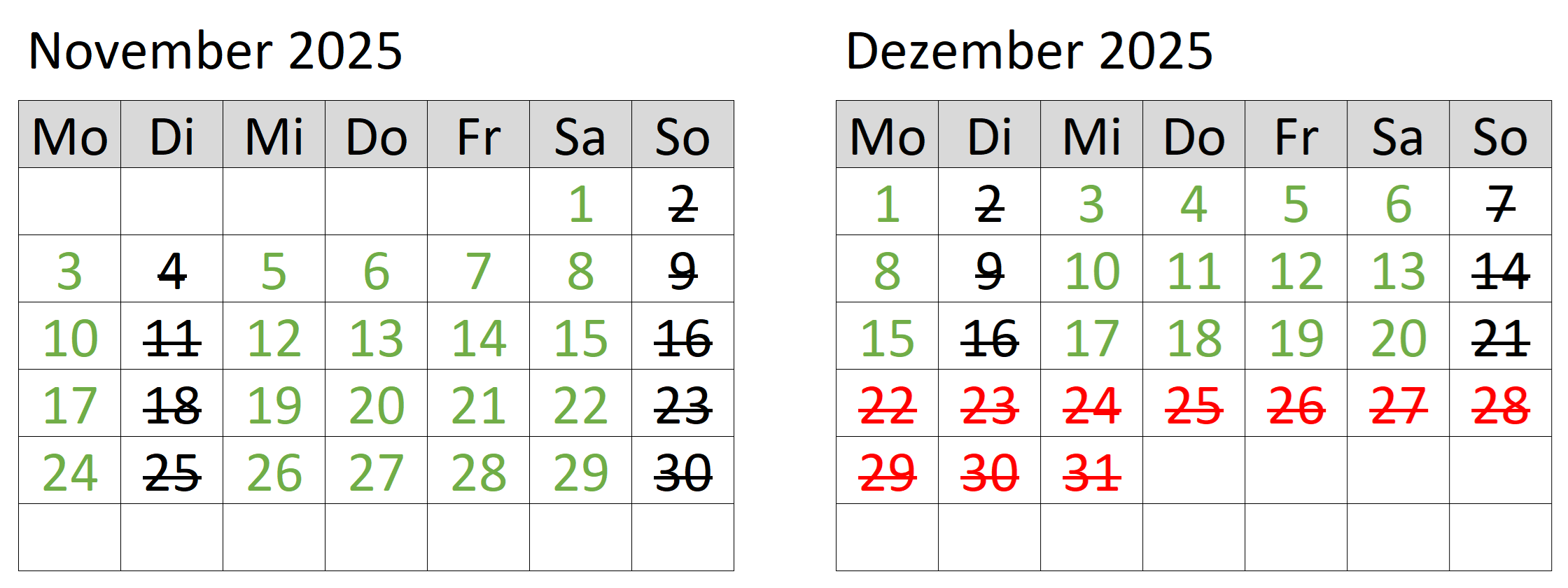 Am 20. Dezember ist der letzte Öffnungstag in diesem Jahr. Ab dem 5. Januar sind wir wieder für Euch da.